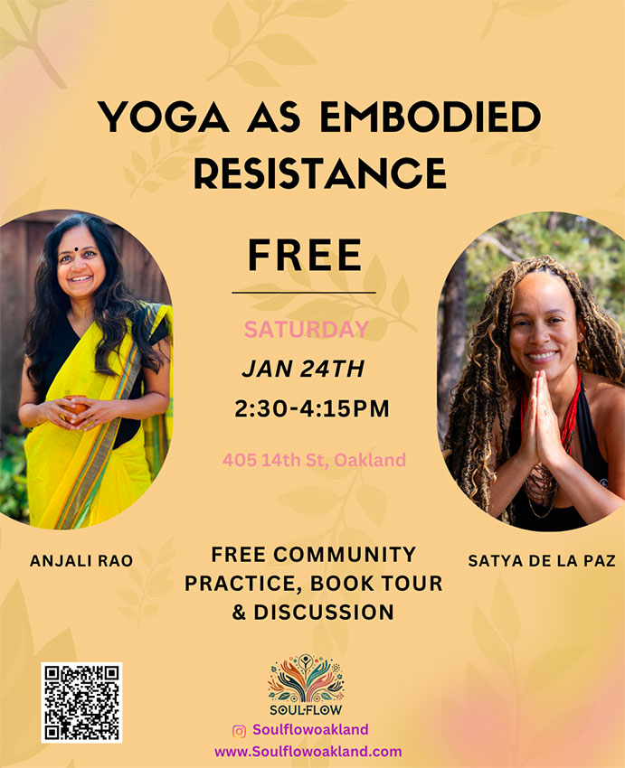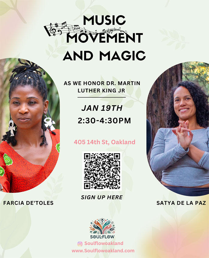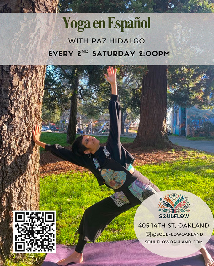 Workshops Yoga en Español With Paz Hidalgo Every 2nd Saturday 2:00 PM Music, Movement, and Magic With Farcia and Satya January 19, 2026 2:30 PM to 4:30 PM Yoga as Embodied Resistance With Farcia and Satya January 24, 2026 2:30 PM to 4:15 PM FREE Full Moon Sound Baths With Gladys Sunday, January 18 Sunday, February 15 Sunday, March 15 6:30 PM to 7:30 PM Movement, Meditation & Microdose Location: Akoma, 1727 Telegraph Ave, Oakland CA Saturday, January 17, 2026 Saturday, February 21, 2026 Saturday, March 21, 2026 (3rd Saturdays) 2:30 PM to 4:30 PM Sound Bath & Acupuncture with Nuffy & Domie Second Friday of Each month 7:00 PM to 8:30 PM Radical Rest for BIPOC With Azhar Last Friday of Each month 6:15 PM to 7:30 PM